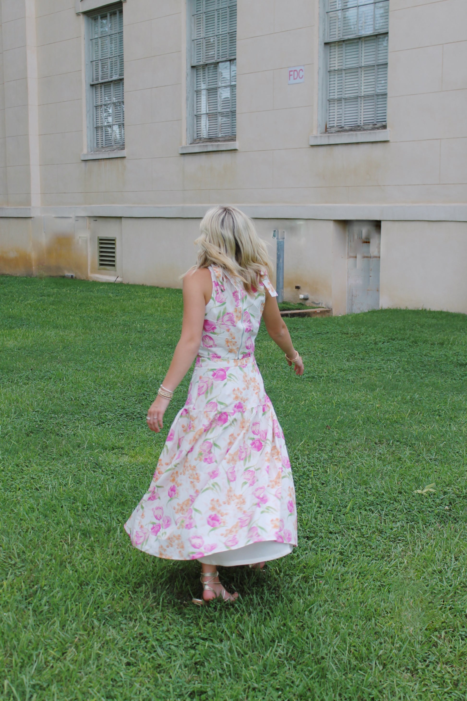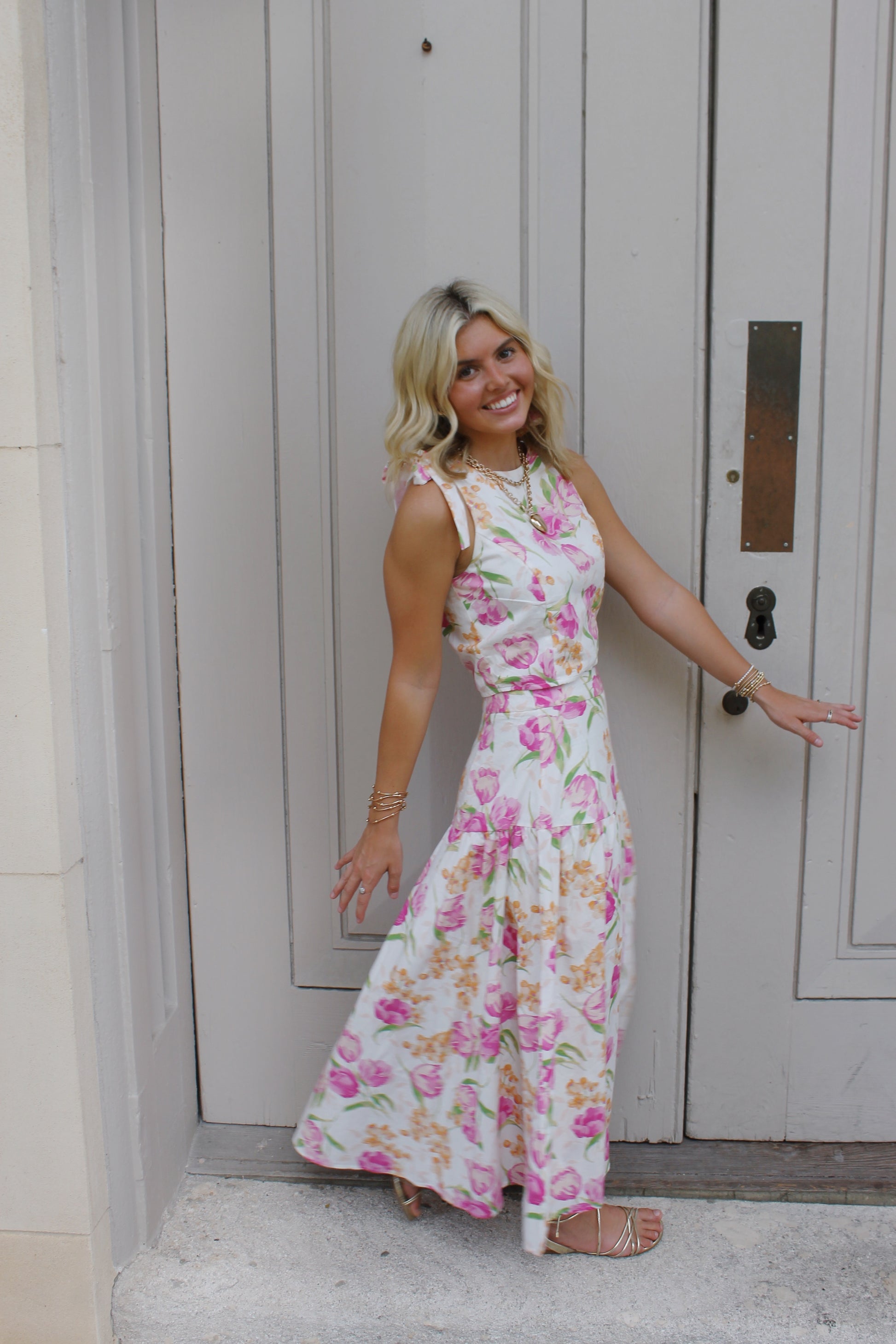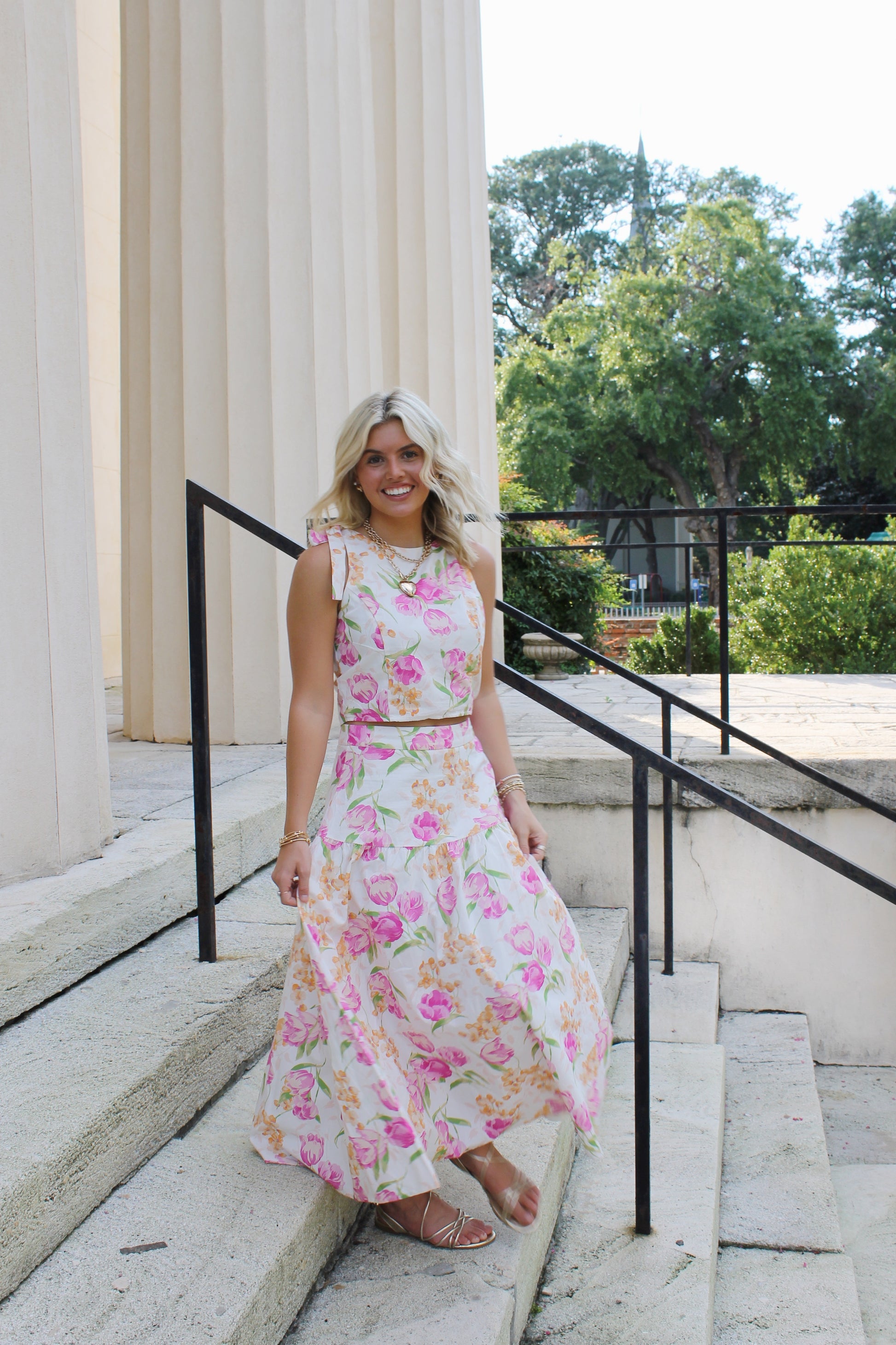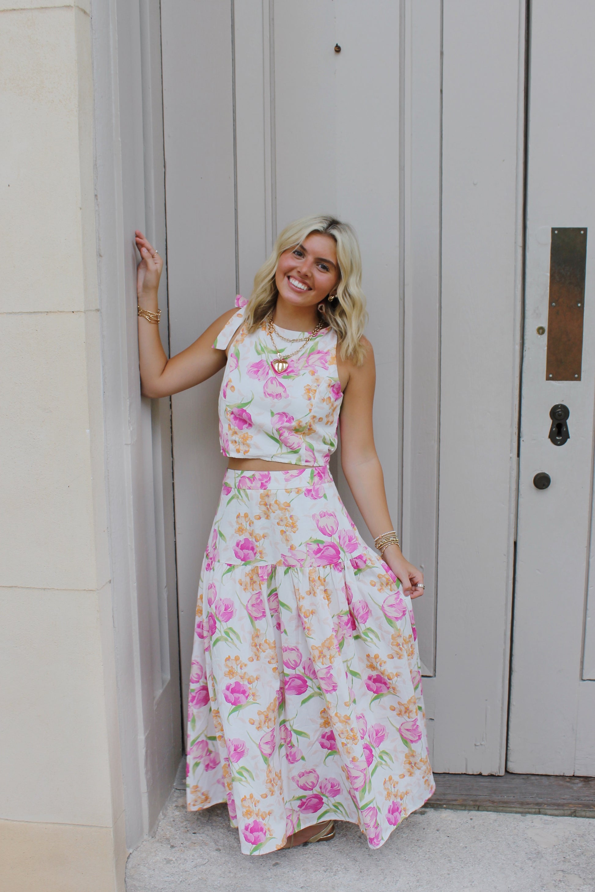 Ivory pink printed woven top and skirt set. Top featuring crop length, round neckline, sleeveless, shoulder tie and back zipper closure. Midi skirt with side zipper closure.
