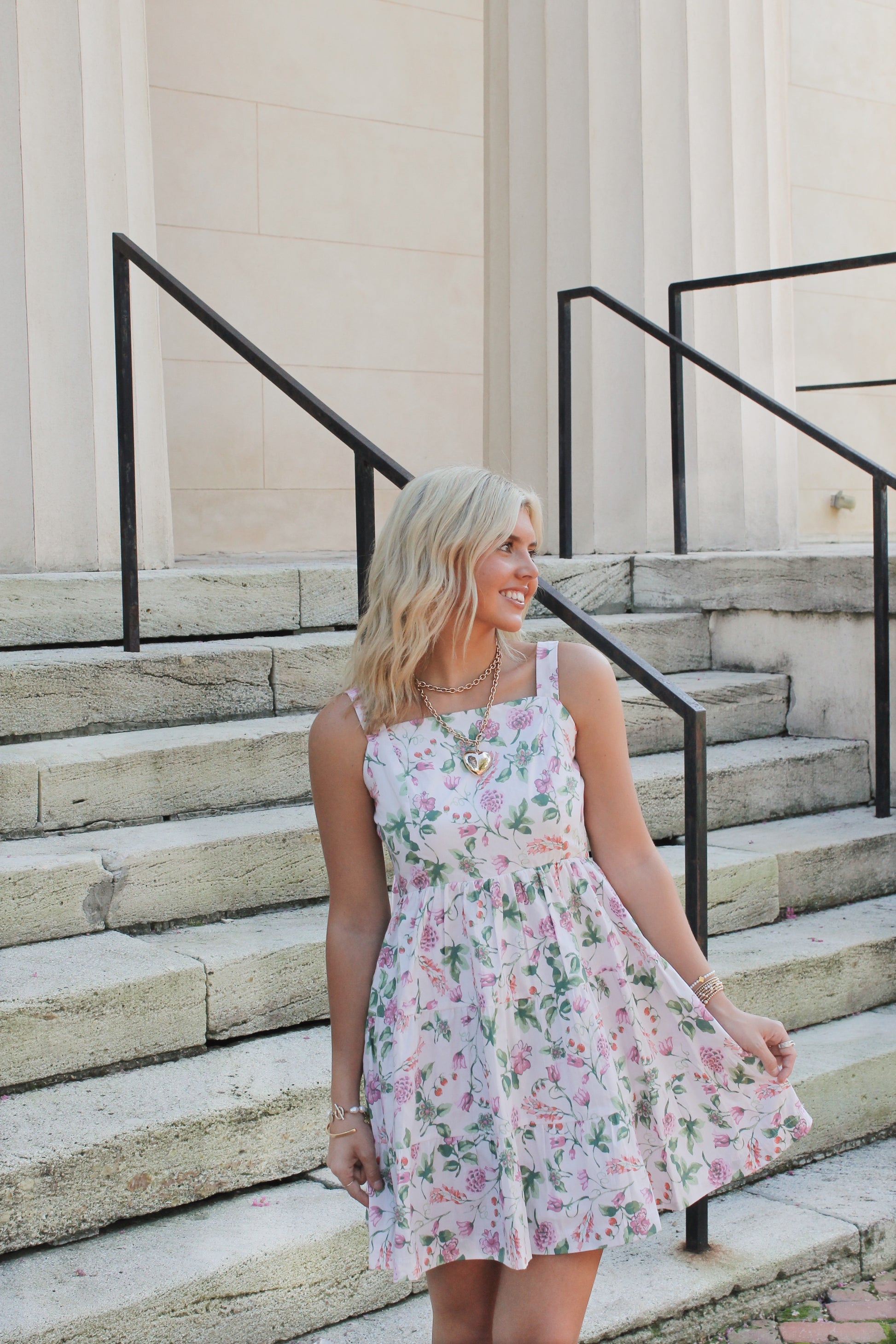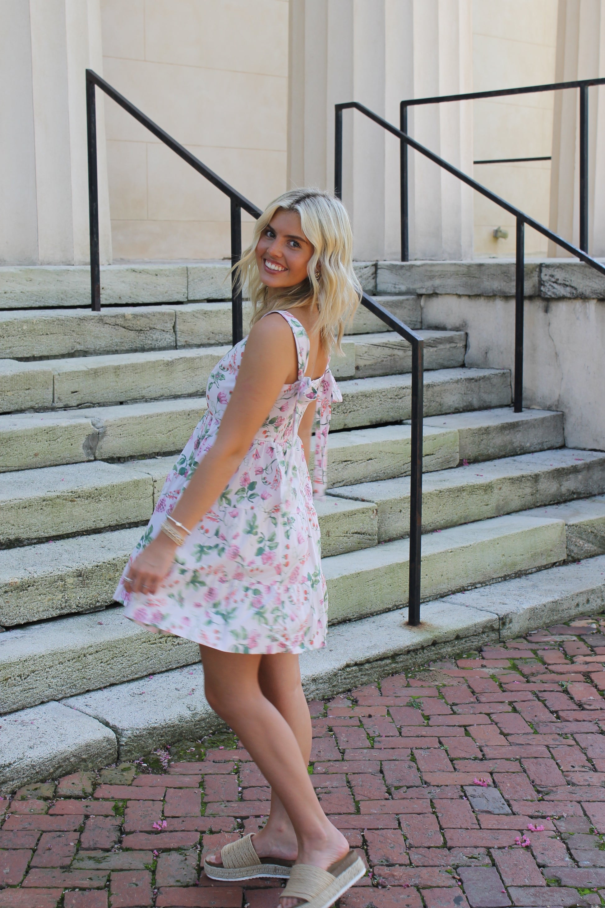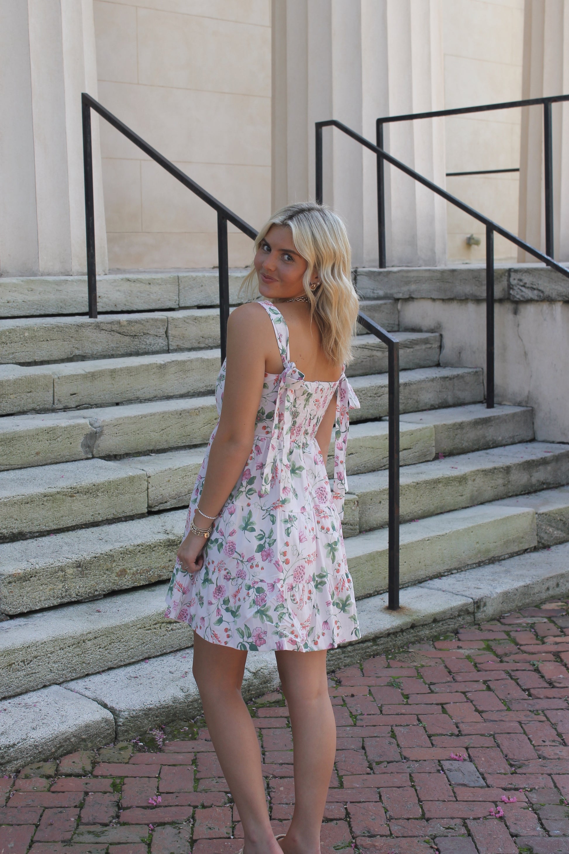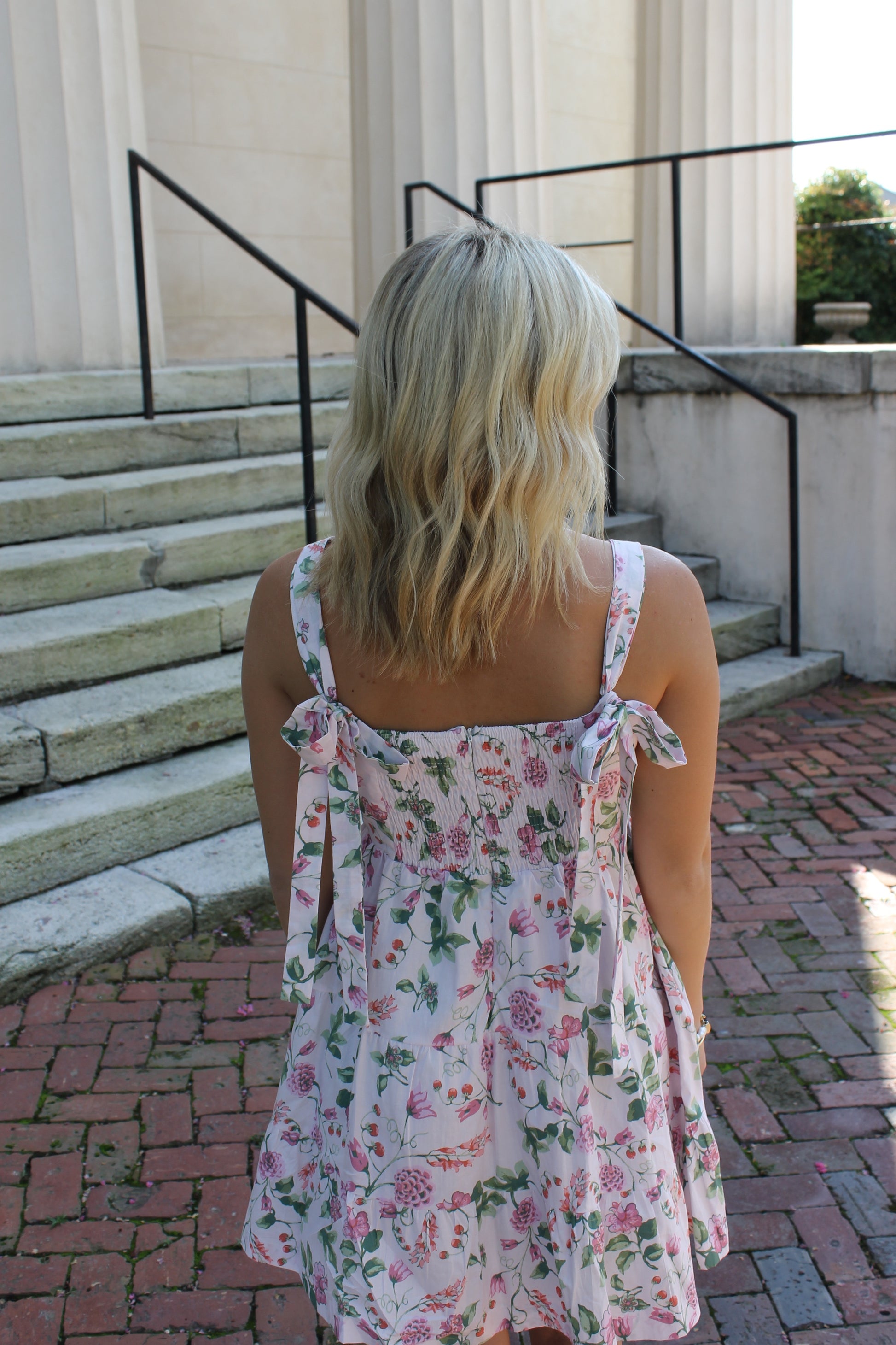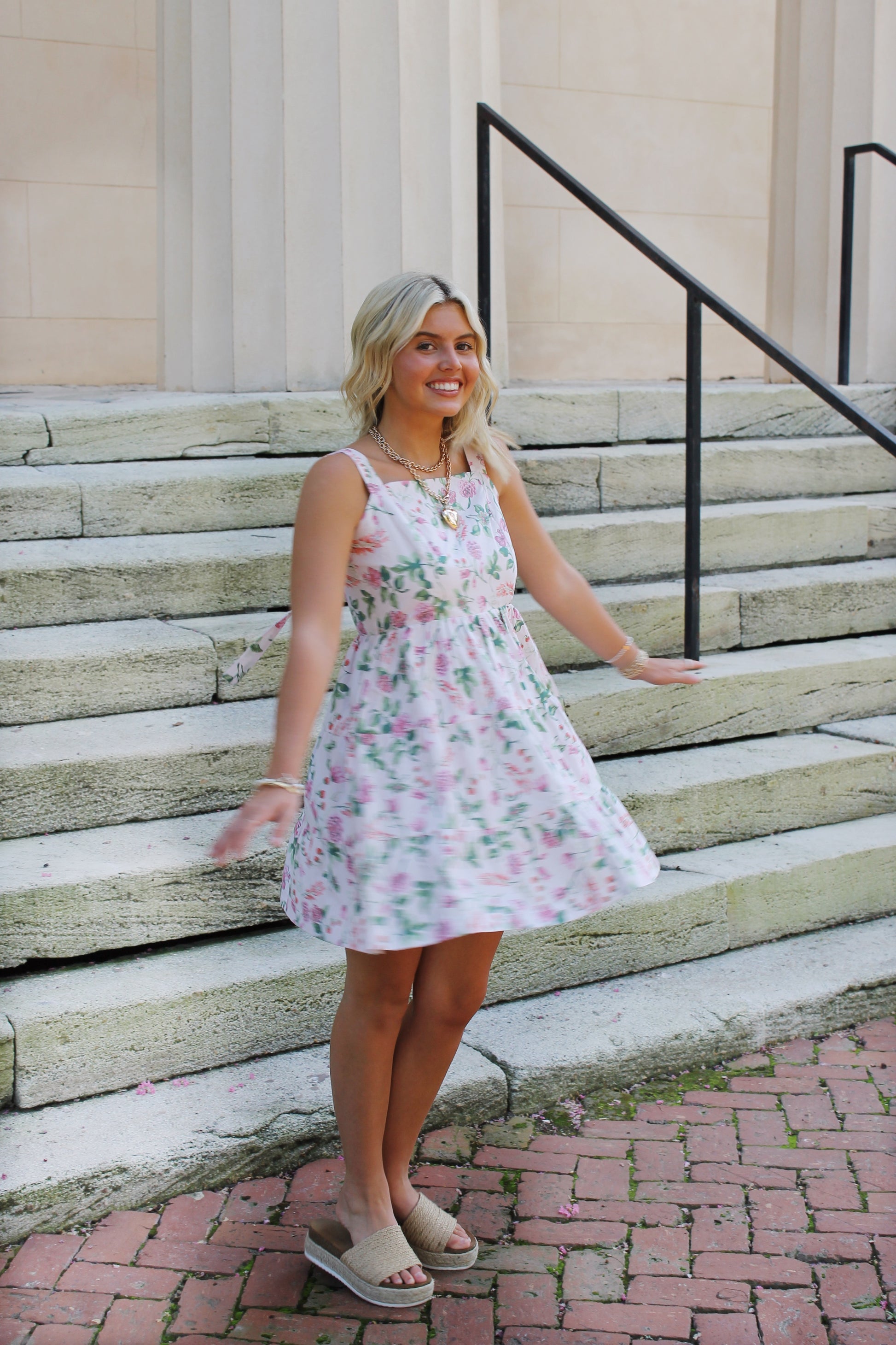 This floral tiered mini dress! Woven floral fabric shapes this too-cute dress that features a fitted bodice, a trendy square neckline, and wide tying straps. A high waist accents the flared silhouette that falls to an A-line skirt with tiered seams and a mini hem. Smocked elastic and hidden zipper on the back.
