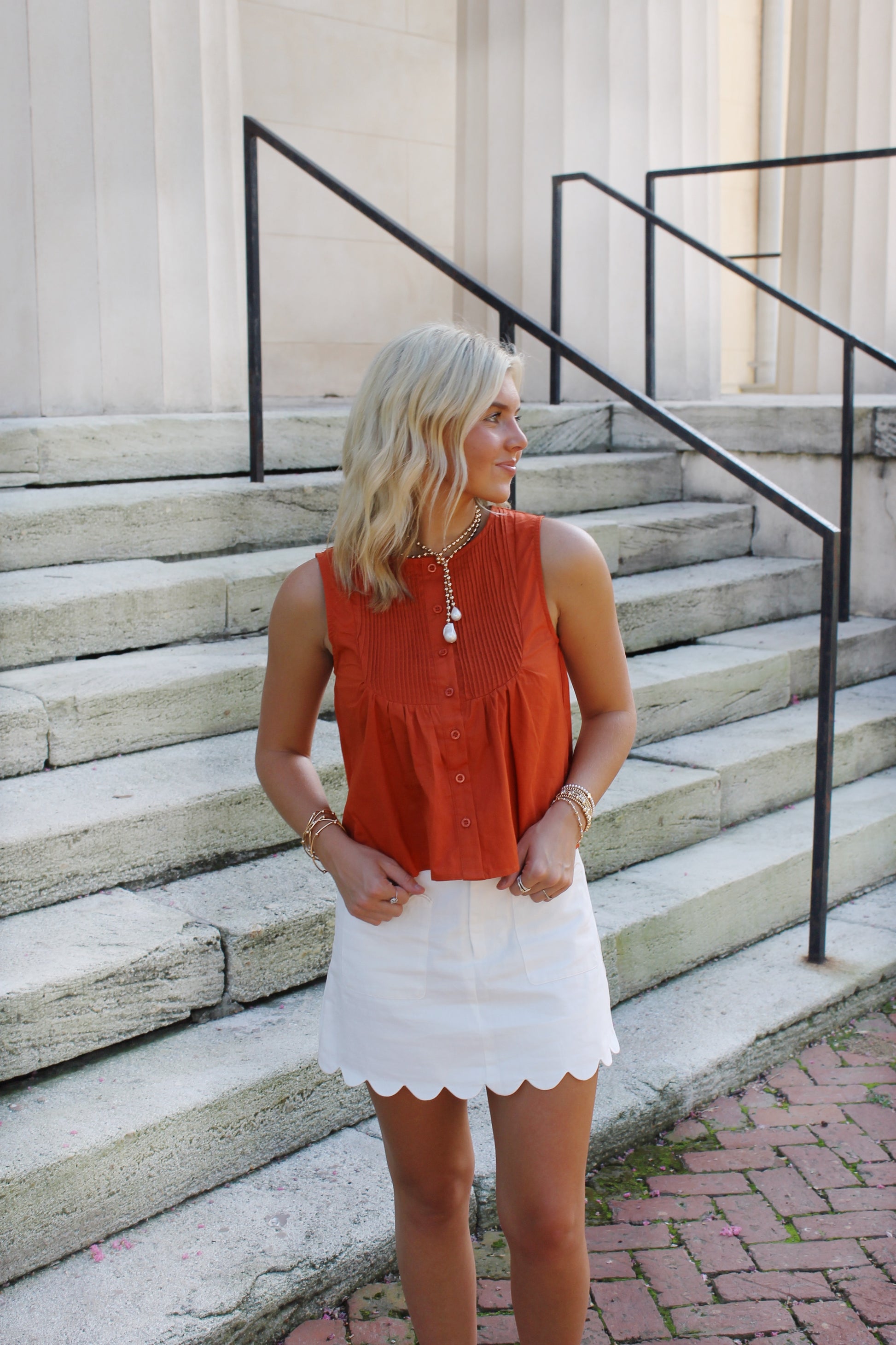 A high-waisted mini skirt featuring scalloped hems and patch pockets with matching scallop trim. Designed with a sleek front button and zip closure.