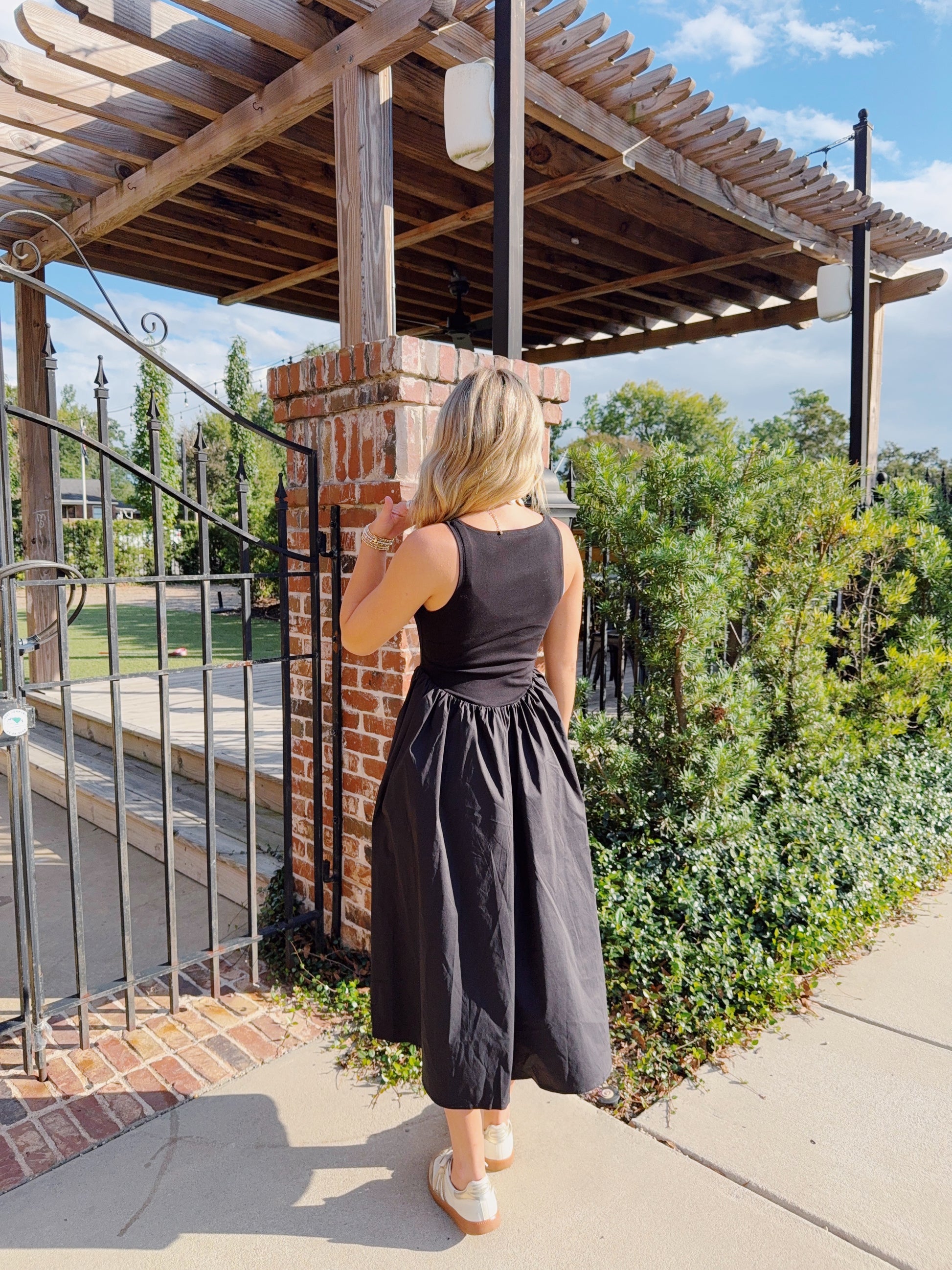 Ribbed knit contrast balloon midi dress in poplin fabric. This sleeveless style features a round neck, ribbed knit bodice, side pockets, and A-line midi skirt.